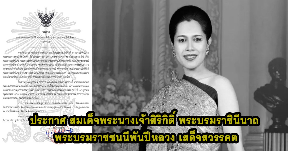 สำนักพระราชวัง เผยแพร่ประกาศ สมเด็จพระนางเจ้าสิริกิติ์ พระบรมราชินีนาถ พระบรมราชชนนีพันปีหลวง สวรรคต