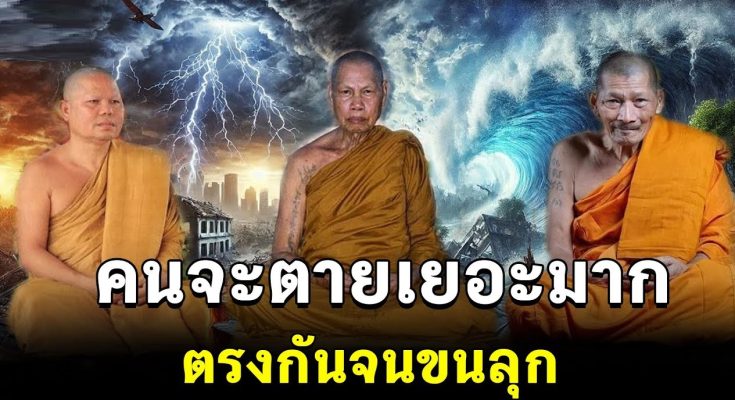 สนองพูดตรงกับอีก 2 รูปว่าคนจะตายเยอะ เพราะประมาทเพราะไม่ฟังเสียงเตือนเพราะ คิดว่าโลกจะเหมือนเดิมตลอดไป 4. ความขน ลุกที่ทำให้ศิษย์ทุกคนเงียบทางวัดเมื่อ คัดคำทำนายของทั้ง 3 รูปมาวางเทียบกัน ศิษย์ทุกคนตกใจเพราะมันตรงกันจนไม่อาจ เป็นเรื่องบังเอิญได้เห็นน้ำสูงเท่าต้น งิ้วเหมือนกันเห็นคนตายมหาศาลแบบไม่ทัน ตั้งตัวเหมือนกันเห็นเสียงแผ่นอินร้อง เหมือนกันเห็นฝนที่ไม่ใช่ฝนเหมือนกันและ เห็นปีที่โลกเริ่มกลับด้านเหมือนกันแต่ ประโยคที่น่ากลัวที่สุดคือประโยคที่ทั้ง 3 รูปพูดตรงกันโดยไม่ได้นัดหมายคือคนจะตาย เยอะมากเพราะไม่เชื่อคำเตือนและทั้งหมด